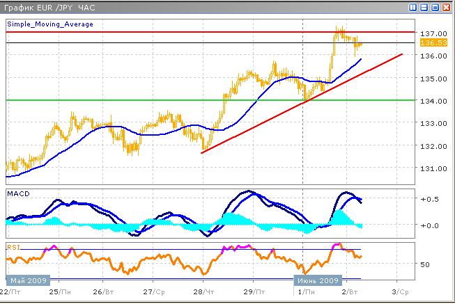 Пара встретила локальное сопротивление у отметки 137.00, которое будет преодолено через некоторое время, поскольку потенциал покупателей еще не исчерпан. Результатом текущей коррекции может стать падение цен к следующему уровню 135.50, что будет достаточно сильным прорывом. В настоящий момент активность медведей выросла, однако ярко выраженного снижения не ожидается, скорее падение вызвано волной взятия прибыли. Индикаторы, в свою очередь, начали сигнализировать об усилении нисходящего тренда, динамика моментума, который иллюстрирован индикаторами на графике, согласуется с ценовым графиком. На часовом графике осциллятор MACD демонстрирует медвежьи настроения, гистограмма развивается в отрицательной зоне, что исключает возможность покупок. Рекомендуется дождаться завершения коррекции и занять позицию в восходящем тренде.