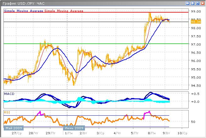 Укрепление доллара США не прошло мимо и японской иены, которая весьма неожиданно упала, чему способствовало приближение индекса Nikkei к отметке 10 000 пкт. Сегодня торги на фондовых площадках Азии протекают с негативными настроениями, поэтому наиболее вероятно укрепление японской валюты, которое может продлиться до середины текущей недели. В среднесрочном плане, паре окажут поддержку фундаментальные факторы, в результате чего цены достигнут новых максимумов в этом году. Технические индикаторы указывают на предстоящее краткосрочное укрепление с максимальной целью 97.00. График индикатора RSI, выйдя из области перекупленности вошел в состояние баланса и продолжил снижение, преодолев средний уровень. В то же время гистограмма осциллятора MACD развивается в негативной зоне, не демонстрируя при этом какой-либо активности продавцов. Такие сигналы позволяют сделать вывод, что снижение будет ограниченным, и достаточно вялым.