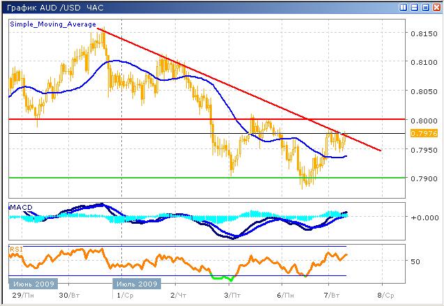 Пара продолжила колебания в широком диапазоне в краткосрочной перспективе, что наблюдается с начала месяца, в очередной раз протестировав уровень поддержки 0.7900, цена устремилась к далекому сопротивлению 0.8000 встретив на своем пути линию нисходящего тренда, которая, вероятно, поставит точку в периоде активности покупателей. Технический анализ информирует о завершении возрастающего тренда, поэтому в течение сегодняшней сессии ожидается снижение. Осциллятор MACD формирует двойной сигнал на продажу, гистограмма пересекает нулевую ось, скользящие средние также пересекаются таким образом, что формируется сигнал к продаже. График индекса относительной силы, не войдя в область перекупленности, развернулся, и тестирует среднюю линию, пересечение которой также даст сигнал к продаже.