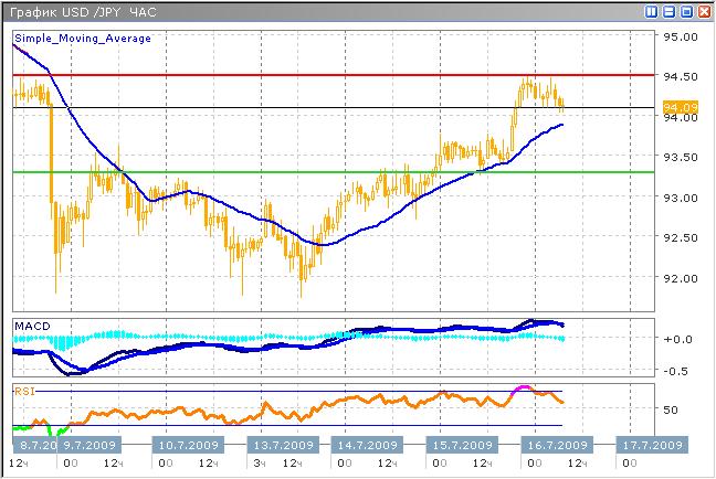 Динамику торгов на валютном рынке в настоящее время определяют фондовые рынки, поскольку они первыми отреагируют на начало восстановительных тенденций в крупнейших экономиках мира. В настоящий момент азиатские рынки растут на фоне оптимизма инвесторов в отношении недавнего позитива на Уолл-стрит. В связи с этим, в краткосрочном периоде ожидается снижение японской валюты против доллара с целью 94.50. В среднесрочной перспективе достаточно велика доля вероятности роста пары к уровню 97.00, после отработки данного уровня, пара будет иметь сильный потенциал к снижению, которого в настоящий момент не хватает. Гистограмма MACD ниже нулевой оси, иллюстрируя падение моментума нисходящего тренда. Противоположный сигнал подает и индикатор RSI, который, отразившись от нижней границы области перекупленности, пересекает среднюю линию. Настоящий момент не является выгодным для входа в рынок, рекомендуется дождаться завершения краткосрочного нисходящего тренда, который уже выдыхается, и занять позицию в бычьем тренде с большим потенциалом к росту.
