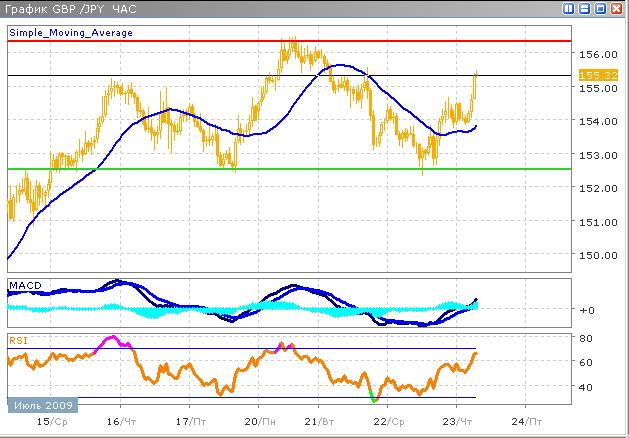 Текущий активный рост стал некоторой неожиданностью, при этом, в среднесрочном плане паре оказана поддержка технических факторов, что достаточно красноречиво видно на часовом графике. В краткосрочном же планировании, наиболее вероятен рост, после непродолжительной коррекции. Цель кратковременного снижения расположена у отметки 155.00, которая соответствует идеям, взятым из свечного анализа, в теории окон. В обозримом будущем ожидается формирование вершины, которая будет иметь пик вблизи уровня сопротивления 156.30. В настоящий момент технические индикаторы указывают на продолжение роста, вследствие активности покупателей, моментум восходящего тренда растет, что иллюстрирует гистограмма MACD, однако, график индикатора RSI приближается к зоне перекупленности. Решение данного факта быками может быть только путем коррекции.