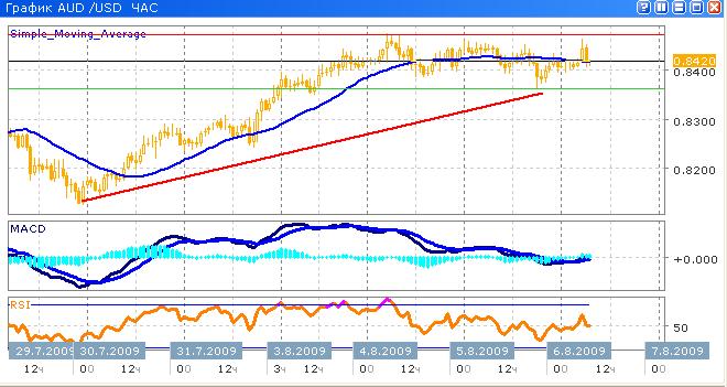 Рост встретил достаточно сильное сопротивление на уровне 0.8470, который, вероятно, будет преодолен в обозримом будущем. Цены на товарных рынках снижаются, рост цен на нефть, очевидно, взял тайм-аут, в результате чего мы и увидели остановку роста австралийской валюты, которая является сырьевой. Технические индикаторы указывают на предстоящий рост в краткосрочной перспективе, который может завершиться тестированием сопротивления. Однако, среднесрочные перспективы остаются бычьими. Гистограмма осциллятора MACD отражает достаточно слабую активность участников рынка с обоих сторон, хотя и развивается в положительной области. График индикатора RSI, после пробоя средней линии при движении снизу вверх, развернулся, что вносит долю неопределенности в предположения о развитии бычьего сценария. В настоящий момент рекомендуется дождаться пробоя заявленного уровня сопротивления, и занять длинную позицию с целью к отметке 0.8600