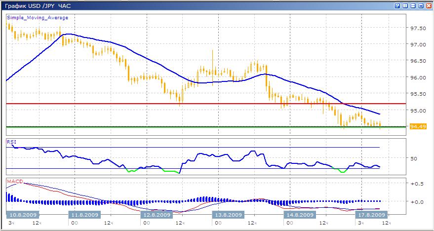 На фоне падения фондовых рынков Азии, японская иена укрепляется против доллара США, при этом снижение пары встретило поддержку на уровне 94.50. в краткосрочной перспективе ожидается очередной отскок, однако среднесрочный тренд остается нисходящим. Технические индикаторы указывают на слабость участников торгов с обеих сторон, гистограмма осциллятора MACD находится около нулевой отметки, что указывает на низкий оптимизм продавцов. С другой стороны, график индикатора RSI в очередной раз отразился от верхней границы области перепроданности, и, по-видимому, нацелился на среднюю линию. В таких условиях рекомендуется дождаться завершения нисходящего тренда, который вызван сугубо снижением на фондовых рынках. Падение рынка в Японии составило значительную величину, вследствие этого, в ближайшее время можно с уверенностью ожидать коррекцию.